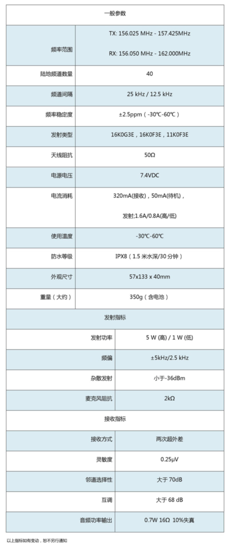 - 本安型防爆(ANSI/UL913標準) - 2300mAh 大容量鋰電池,交流3小時快速充電 - 5W/1W 輸出功率 - IPX8 防水等級(1.5米水深/30分鐘) - 國際、美國和加拿A大海事頻道