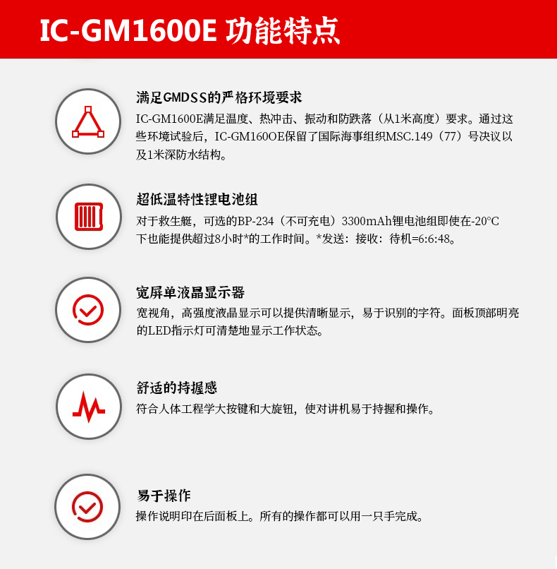 超低溫條件下同樣耐用,在-20℃條件下3300mAh鋰電池(BP-234)工作時(shí)間超過(guò)8小時(shí) ,可提供中國(guó)船籍社(CCS)證書(shū)【證書(shū)單獨(dú)付費(fèi),周期不短,購(gòu)買(mǎi)前請(qǐng)先與客服聯(lián)系確認(rèn)證書(shū)提供周期】,是GMDSS設(shè)備之一。