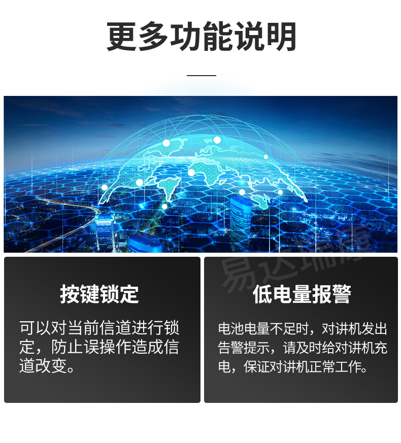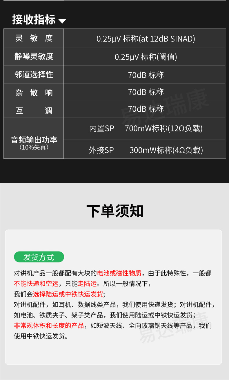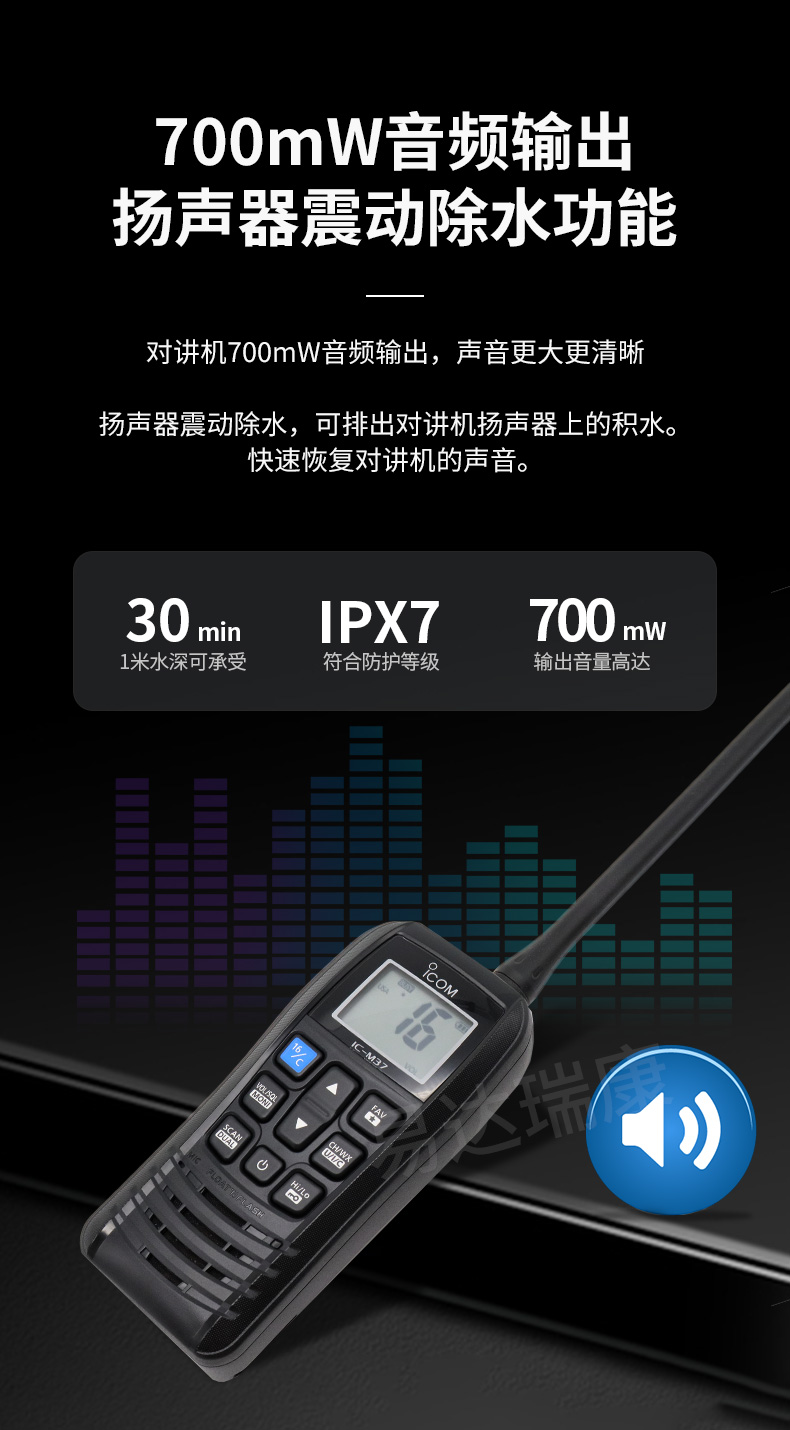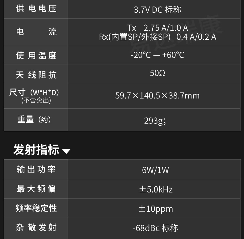 IPX7級防水設計,按鍵大,握感好,手感舒適,方便操作,使用稱心, 6 W大功率射頻輸出,傳輸更遠,更安心可靠, 700 mW音頻輸出
