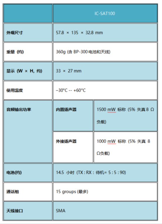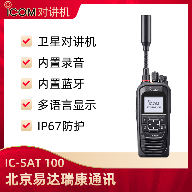 • Icom IC-SAT100M是專用的衛星按鍵通話(PTT)對講機,是唯一一款只需按下一個按鈕即可在組和個人之間提供實時通信的PTT對講機。