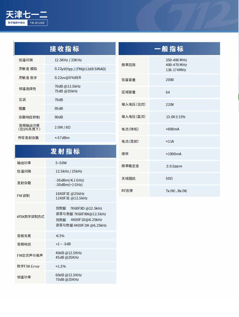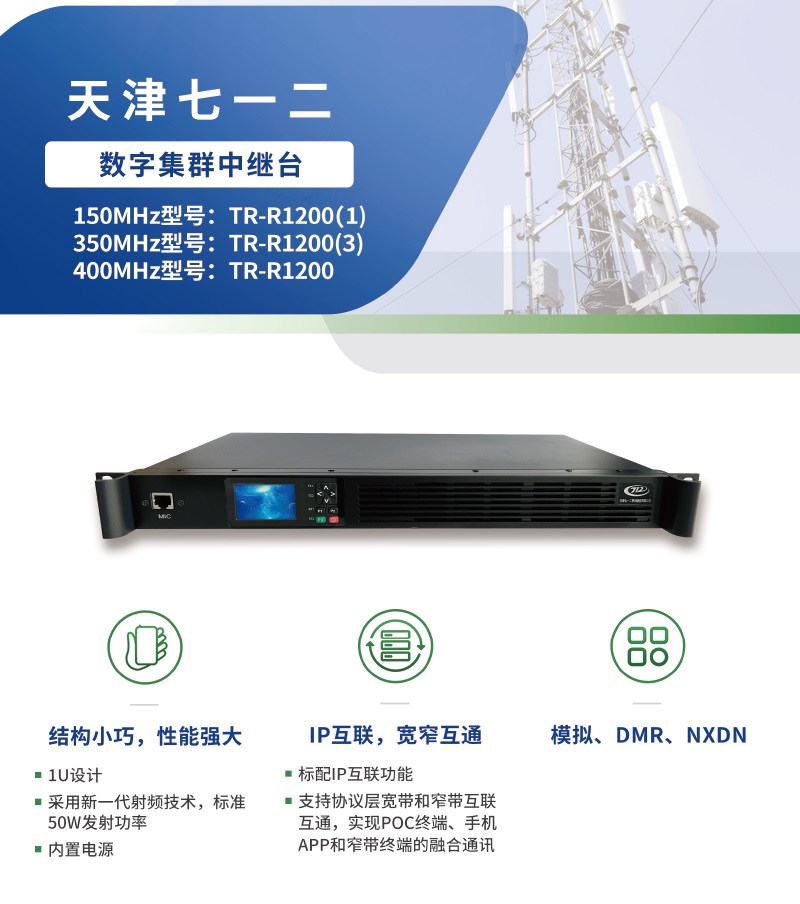 天津七一二數字集群多模式1U中繼臺VHF:TR-R1200(1),UHF:TR-R1200,350M:TR-R1200(3)