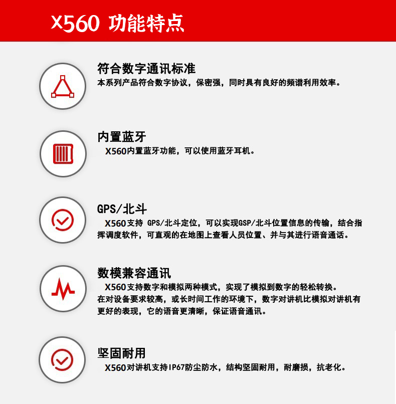 數字鍵盤可以選擇呼叫某一個人或某一組人,液晶屏可以顯示電池電量、信號強弱和所使用的信道數或具體頻率。7級防水可以保證在1米水深30分鐘不進水,本質安全型防爆適合用在加油站,鉆井平臺,化工廠,制藥廠,燃氣站等有可能會有易燃易爆氣體和粉塵的場所。內置GPS/北斗定位可實現所在位置信息的傳輸